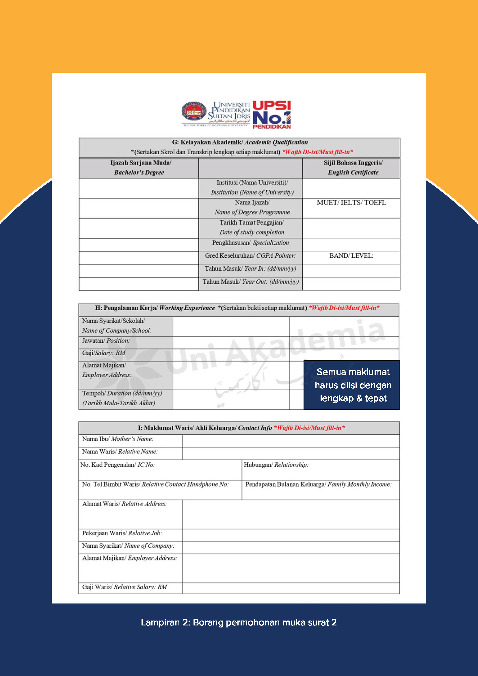 Calon boleh mendapatkan google form yang dikongsikan oleh pihak sekretariat melalui hebahan iklan di laman media sosial ATAU Calon boleh mendapatkan google form dengan menghubungi pihak sekretariat Uni Akademia melalui talian 03-89220952 atau Whatsapp 019-5592782
