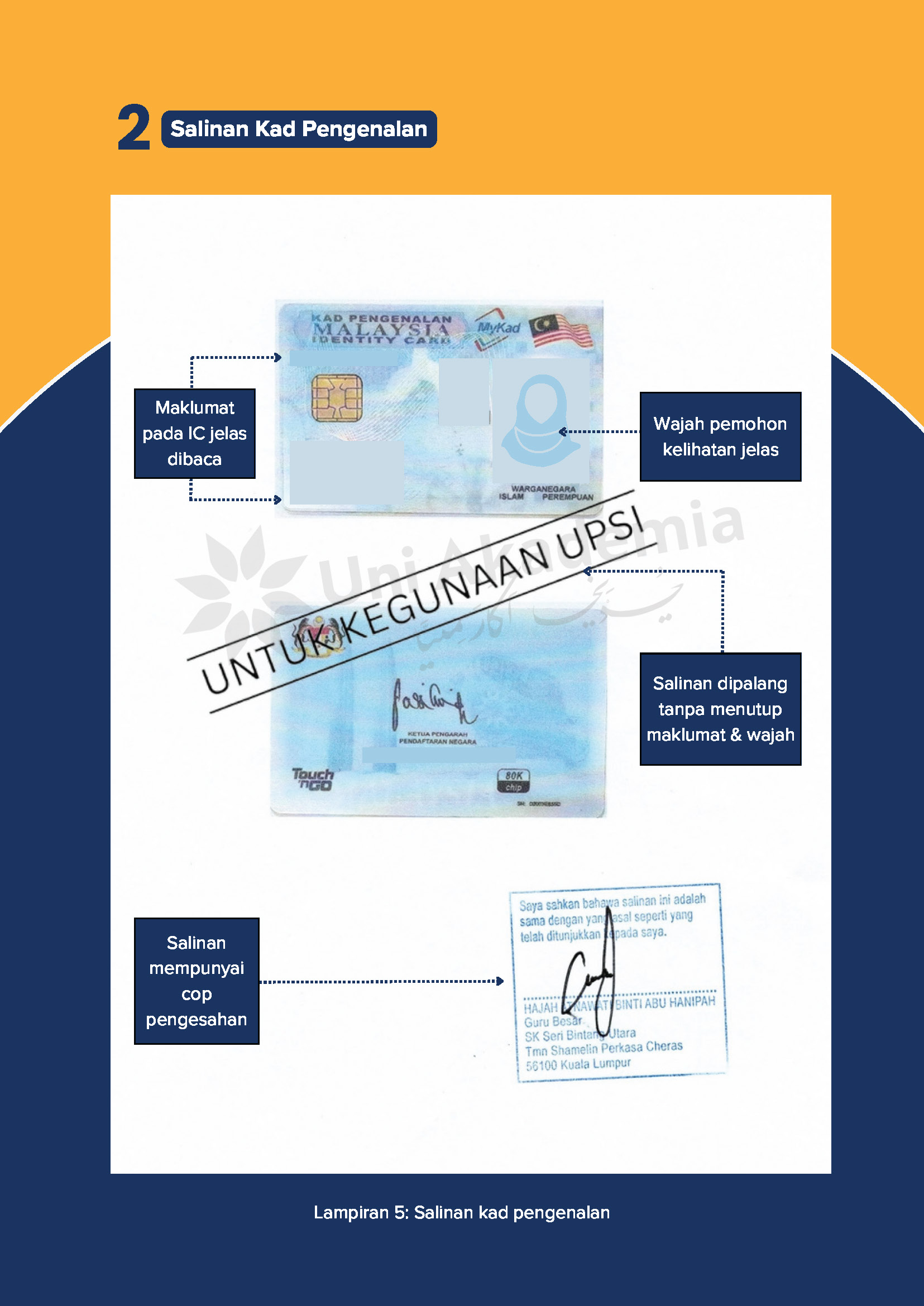 Semua dokumen mencukupi termasuk maklumat di borang permohonan adalah lengkap. Semua salinan dokumen hendaklah disahkan oleh mana-mana pegawai gred 41 ke atas. Salinan IC hendaklah dipalang “UNTUK KEGUNAAN UPSI”.