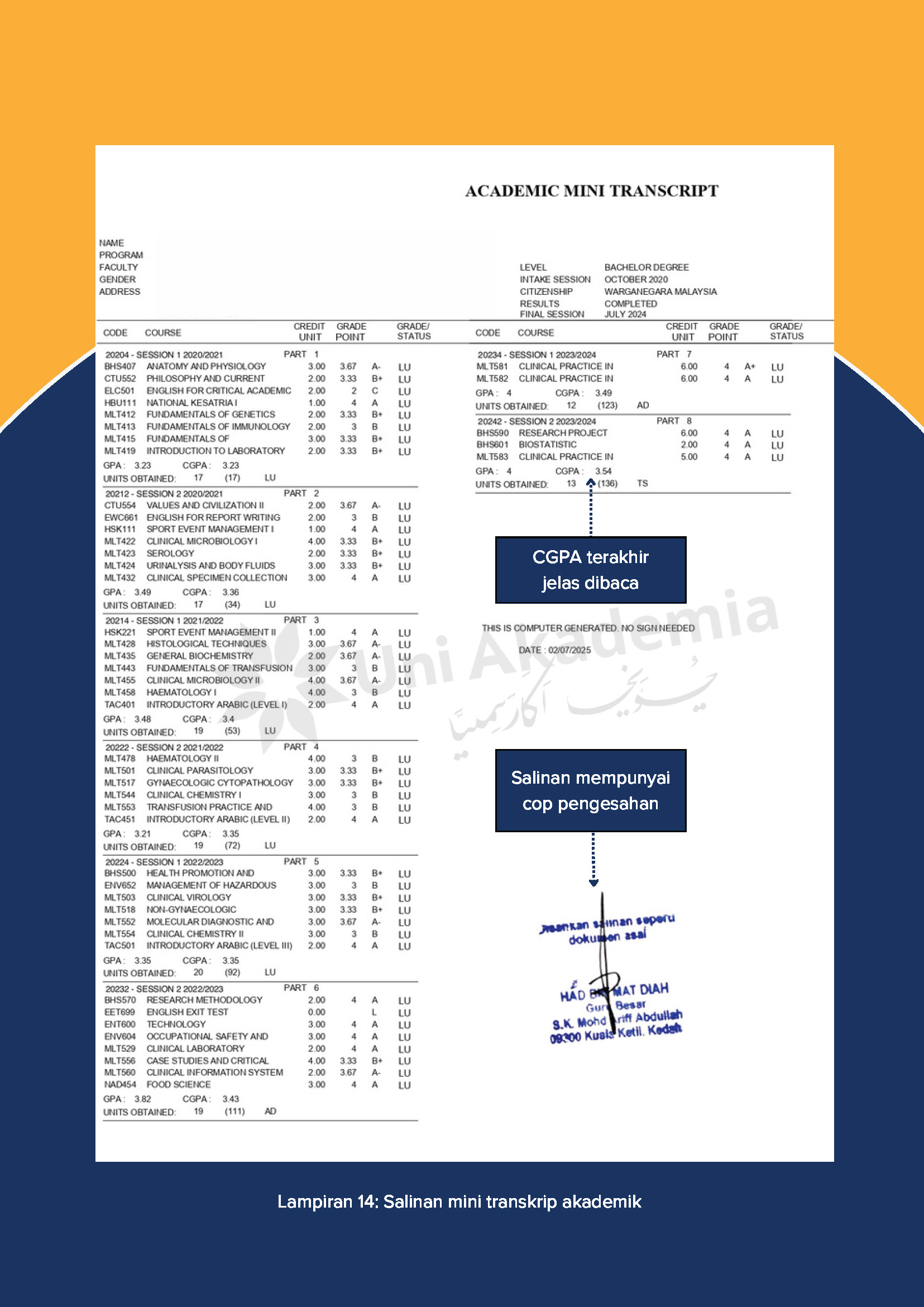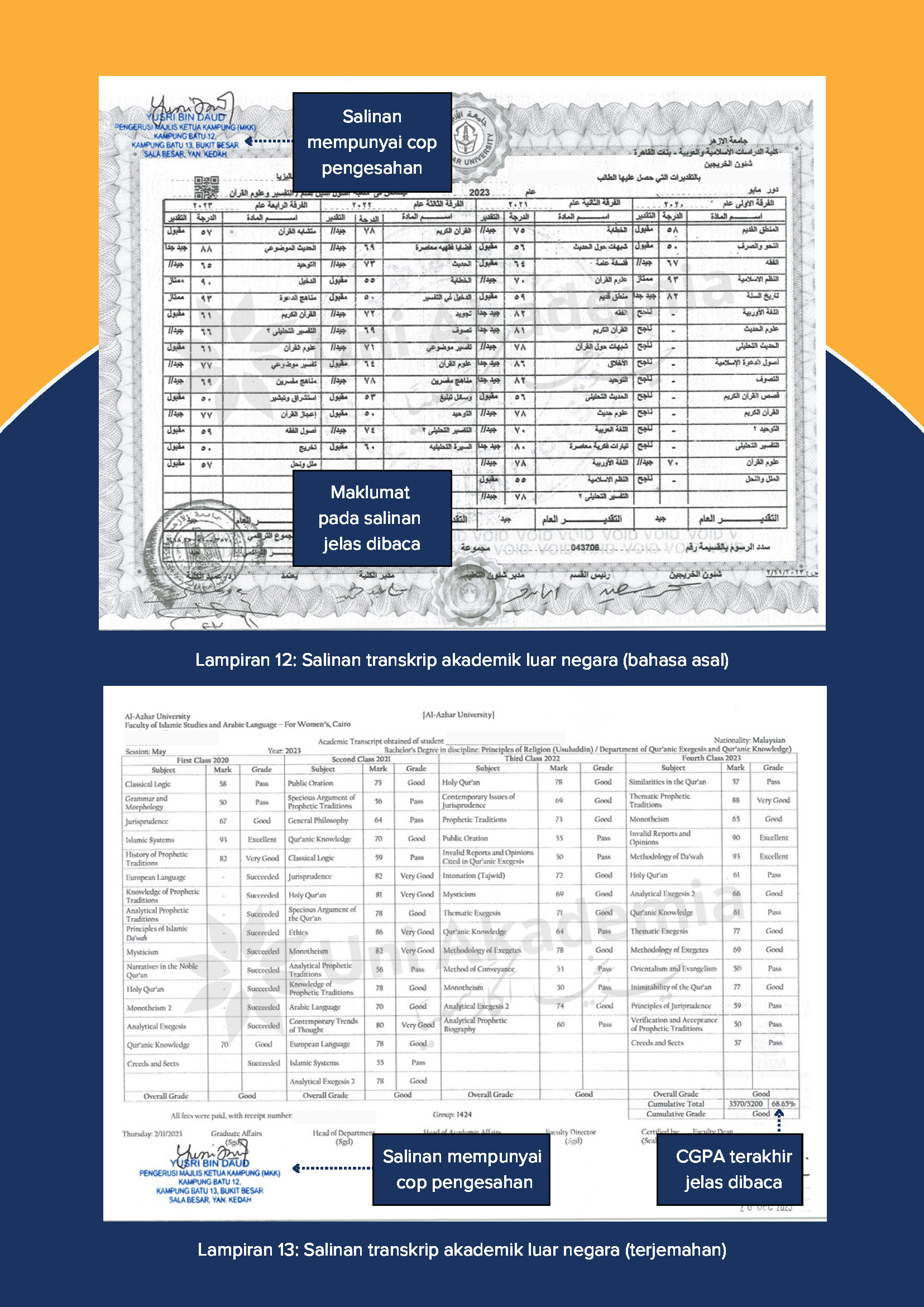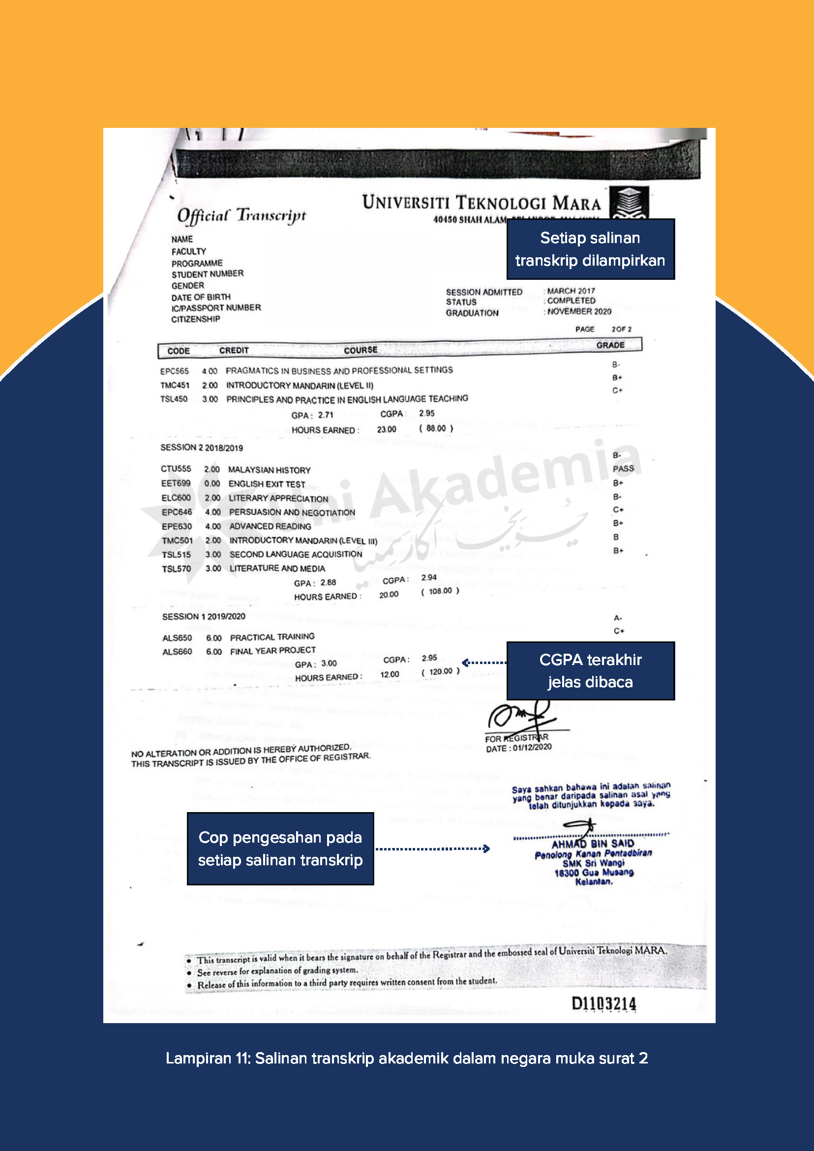 - Salinan asal transkrip akademik Ijazah Sarjana Muda (bahasa asal) DAN salinan transkrip akademik Ijazah Sarjana Muda (terjemahan) ATAU mini transkrip (sekiranya belum bergraduasi)