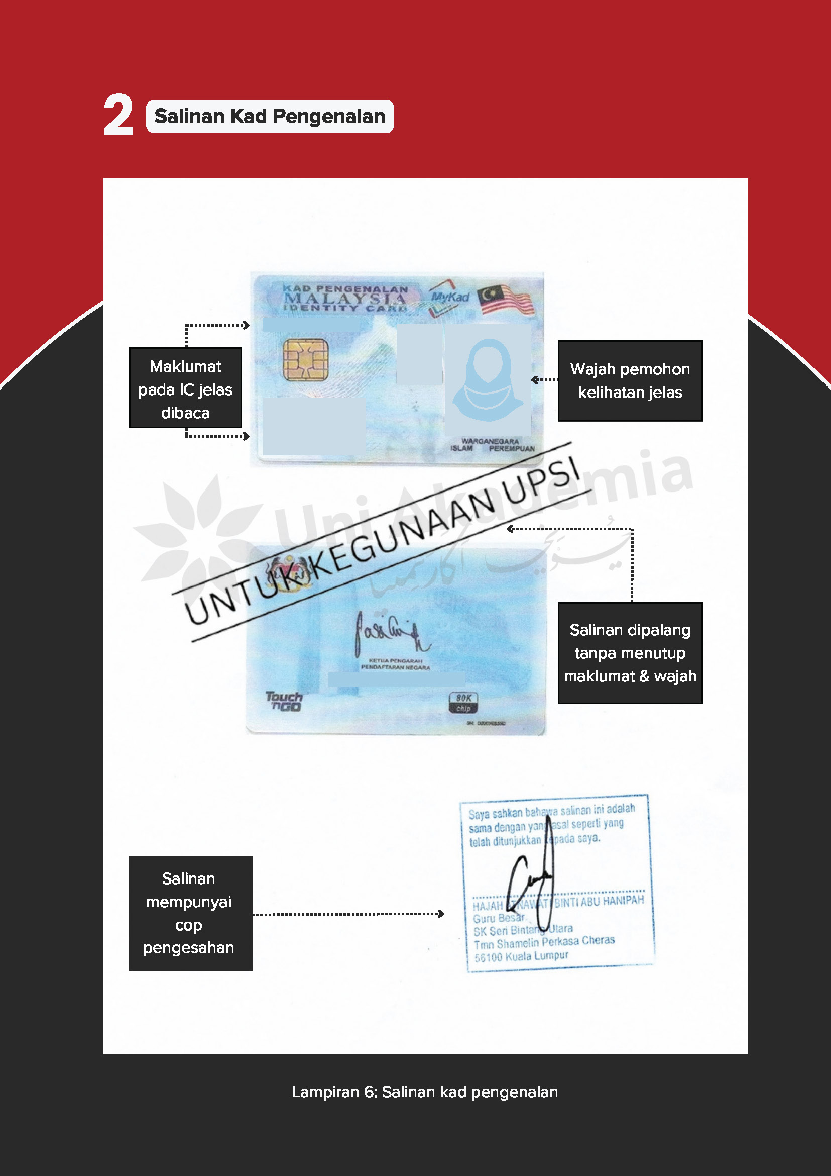 Semua dokumen mencukupi termasuk maklumat di borang permohonan adalah lengkap. Semua salinan dokumen hendaklah disahkan oleh mana-mana pegawai gred 41 ke atas. Salinan IC hendaklah dipalang “UNTUK KEGUNAAN UPSI”