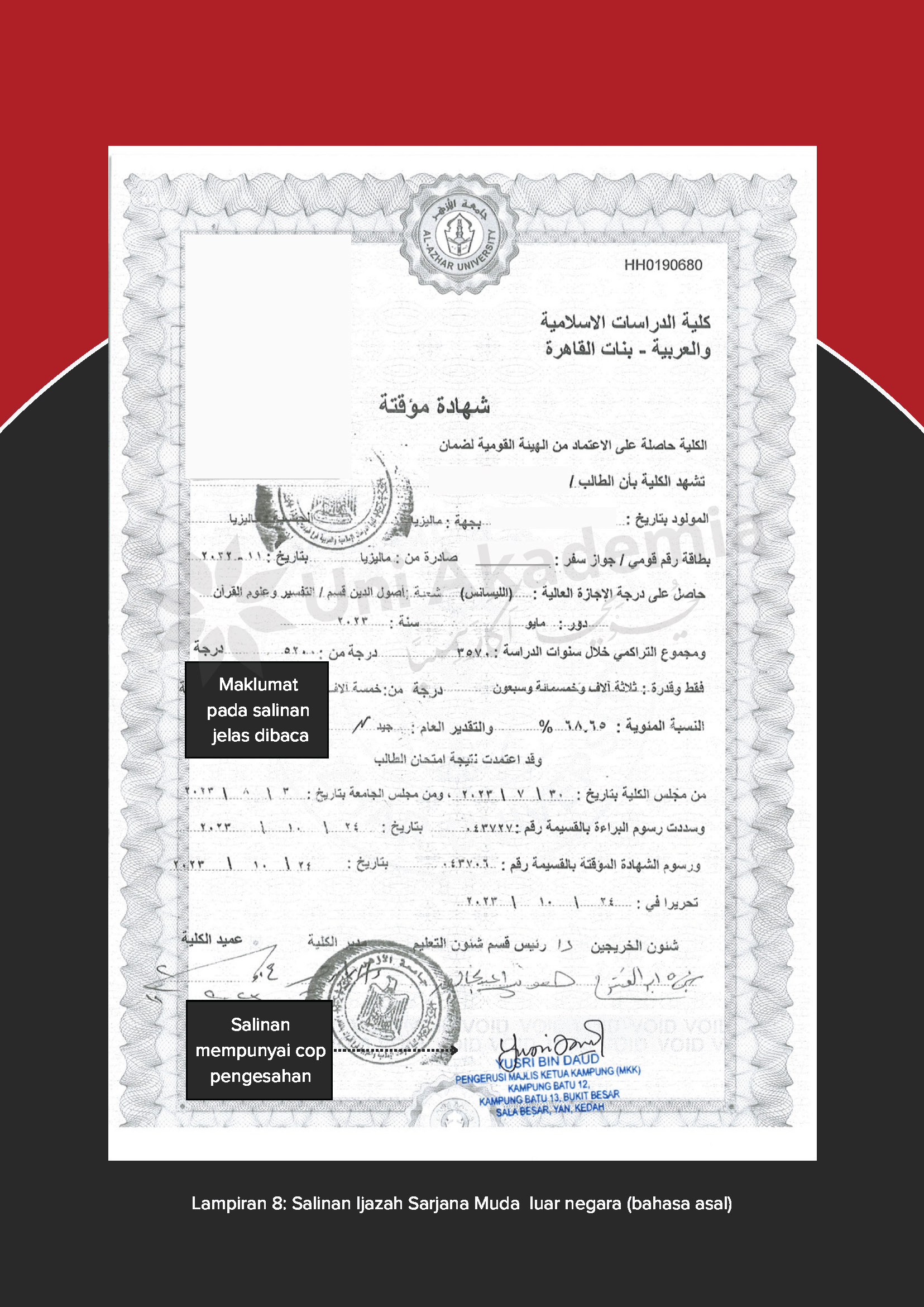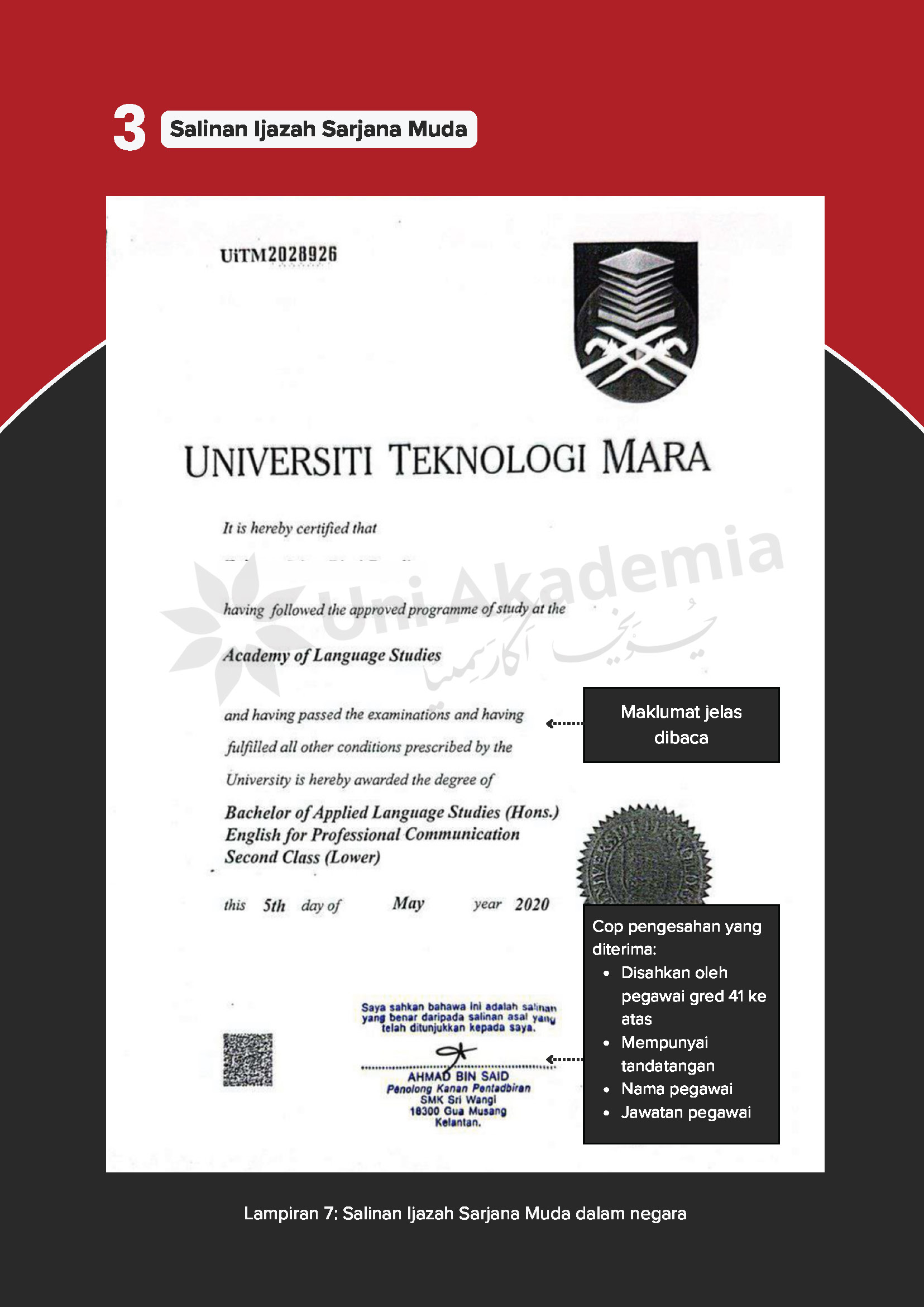 - Salinan asal Ijazah Sarjana Muda (bahasa asal) DAN Salinan Ijazah Sarjana Muda (terjemahan) ATAU surat pengesahan tamat pengajian (sekiranya belum bergraduasi)