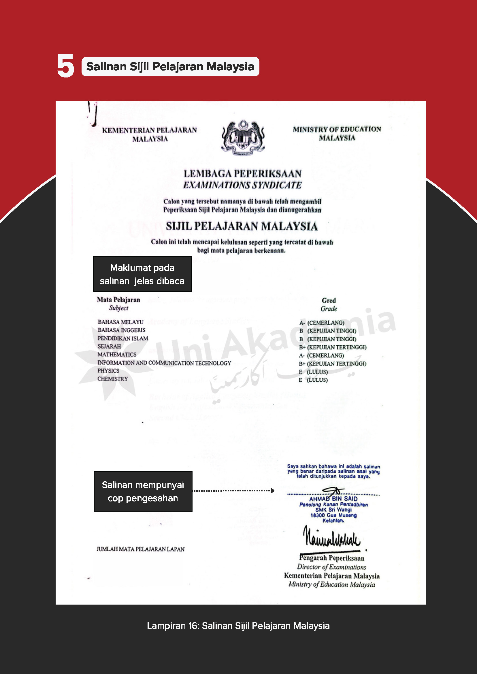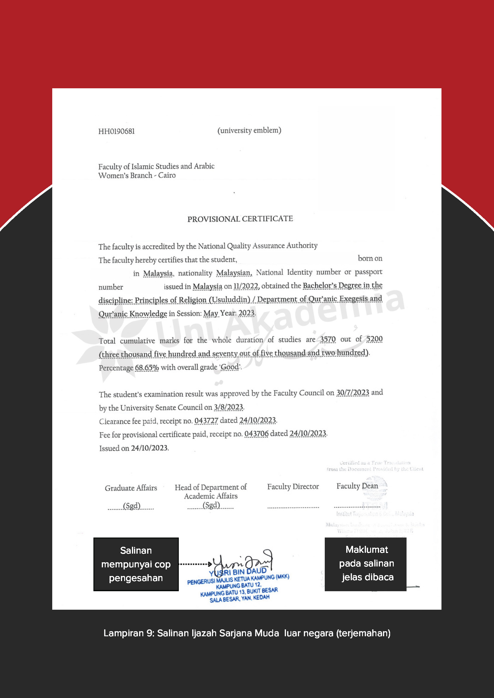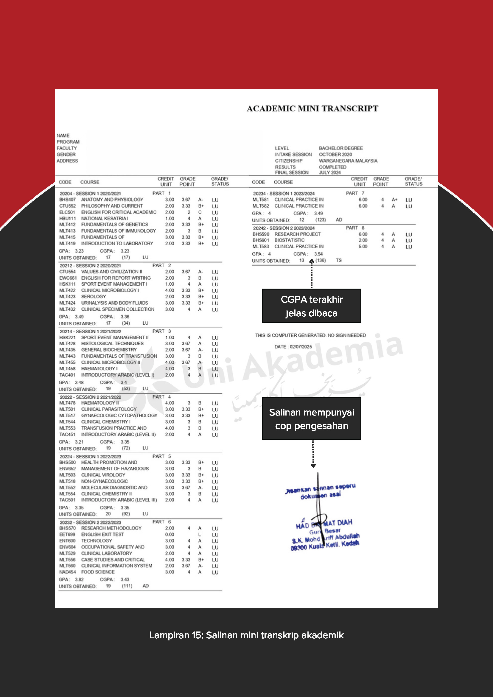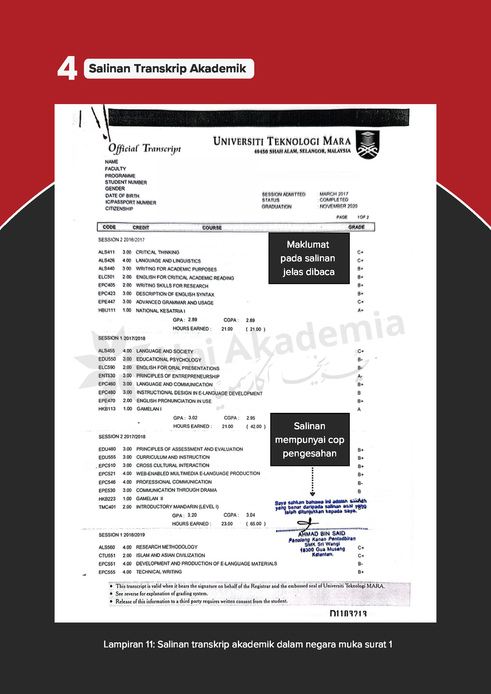 - Salinan asal transkrip akademik Ijazah Sarjana Muda (bahasa asal) DAN salinan transkrip akademik Ijazah Sarjana Muda (terjemahan) ATAU mini transkrip (sekiranya belum bergraduasi)