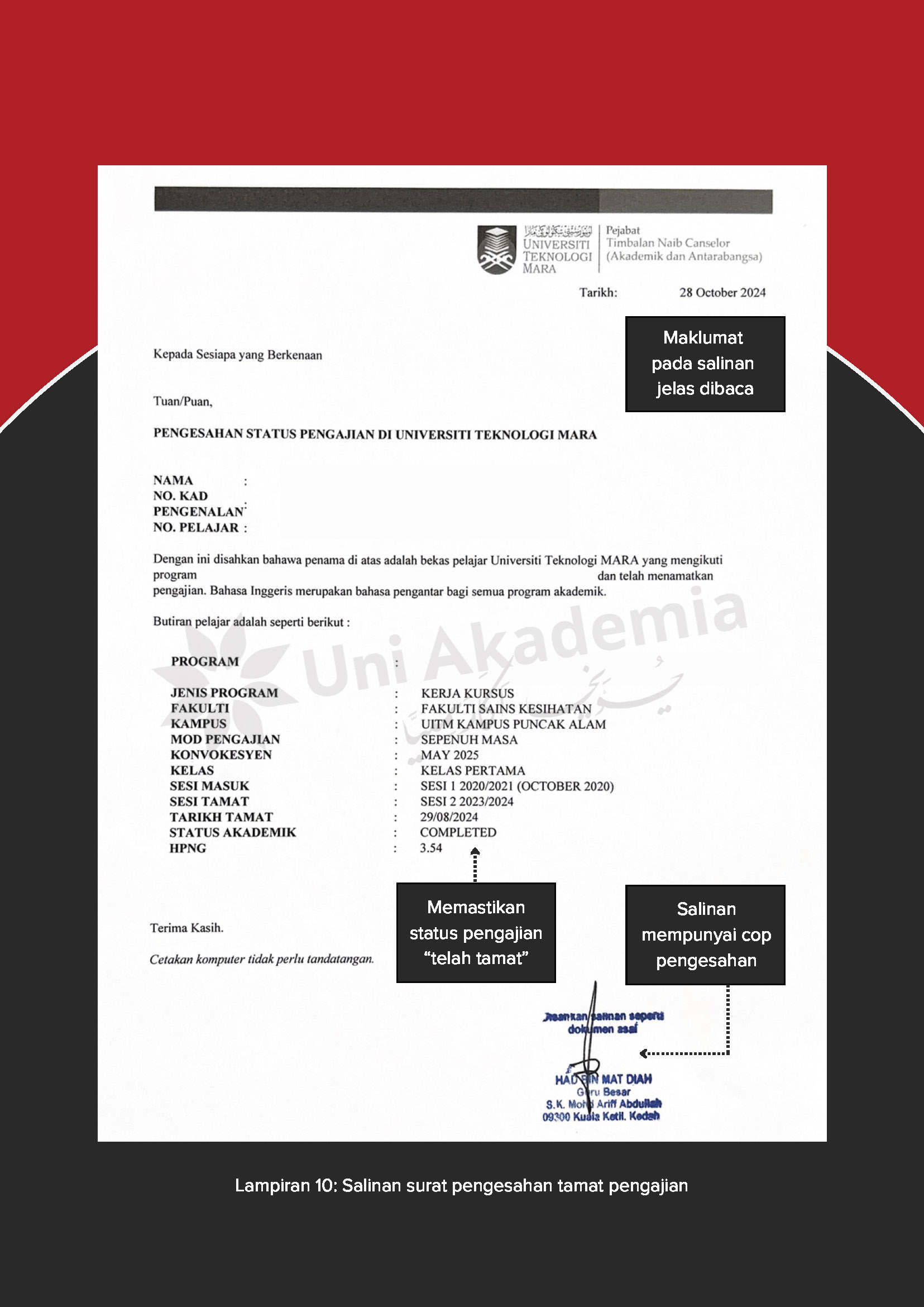 - Salinan Ijazah Sarjana Muda ATAU surat pengesahan tamat pengajian (sekiranya belum bergraduasi)