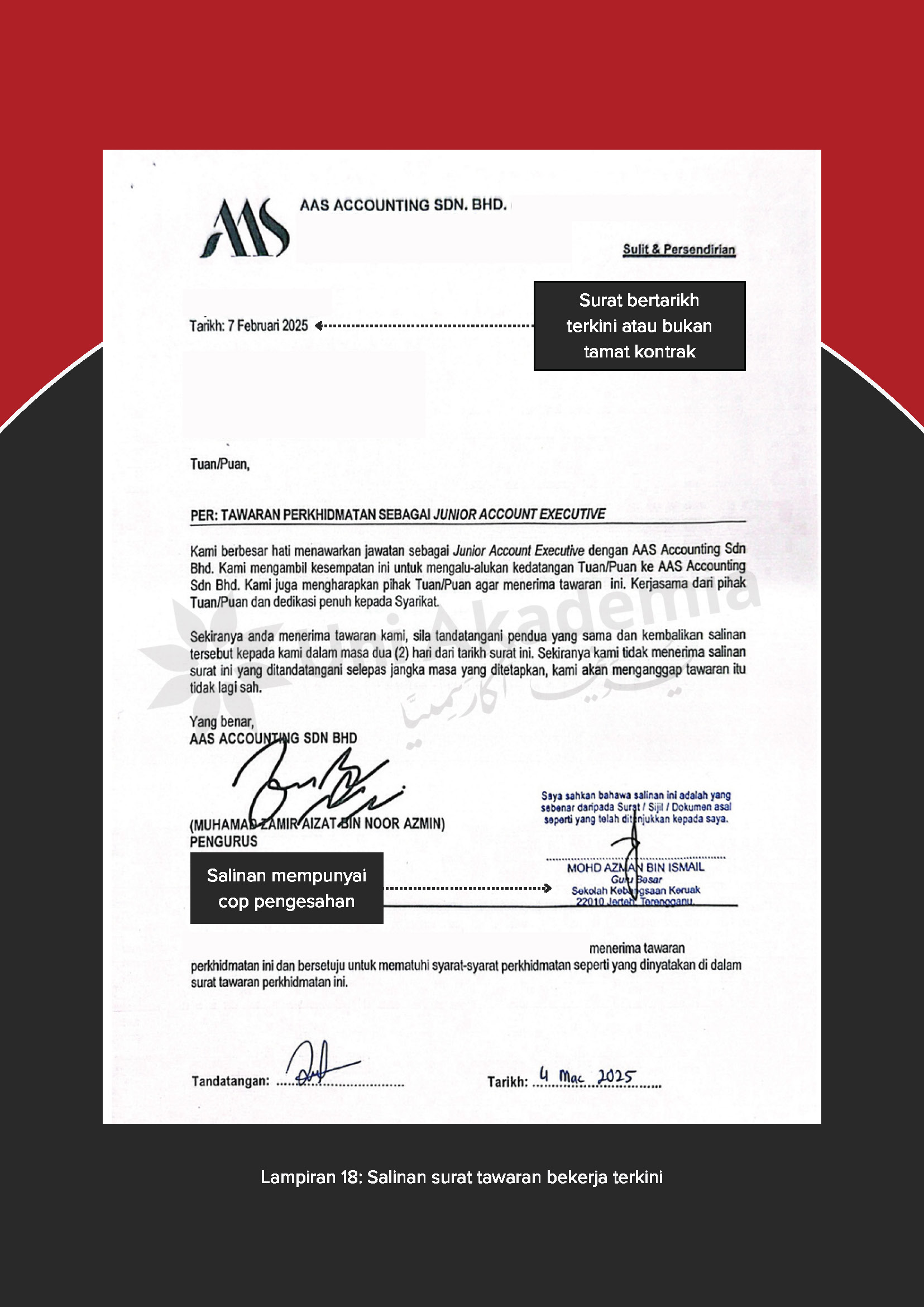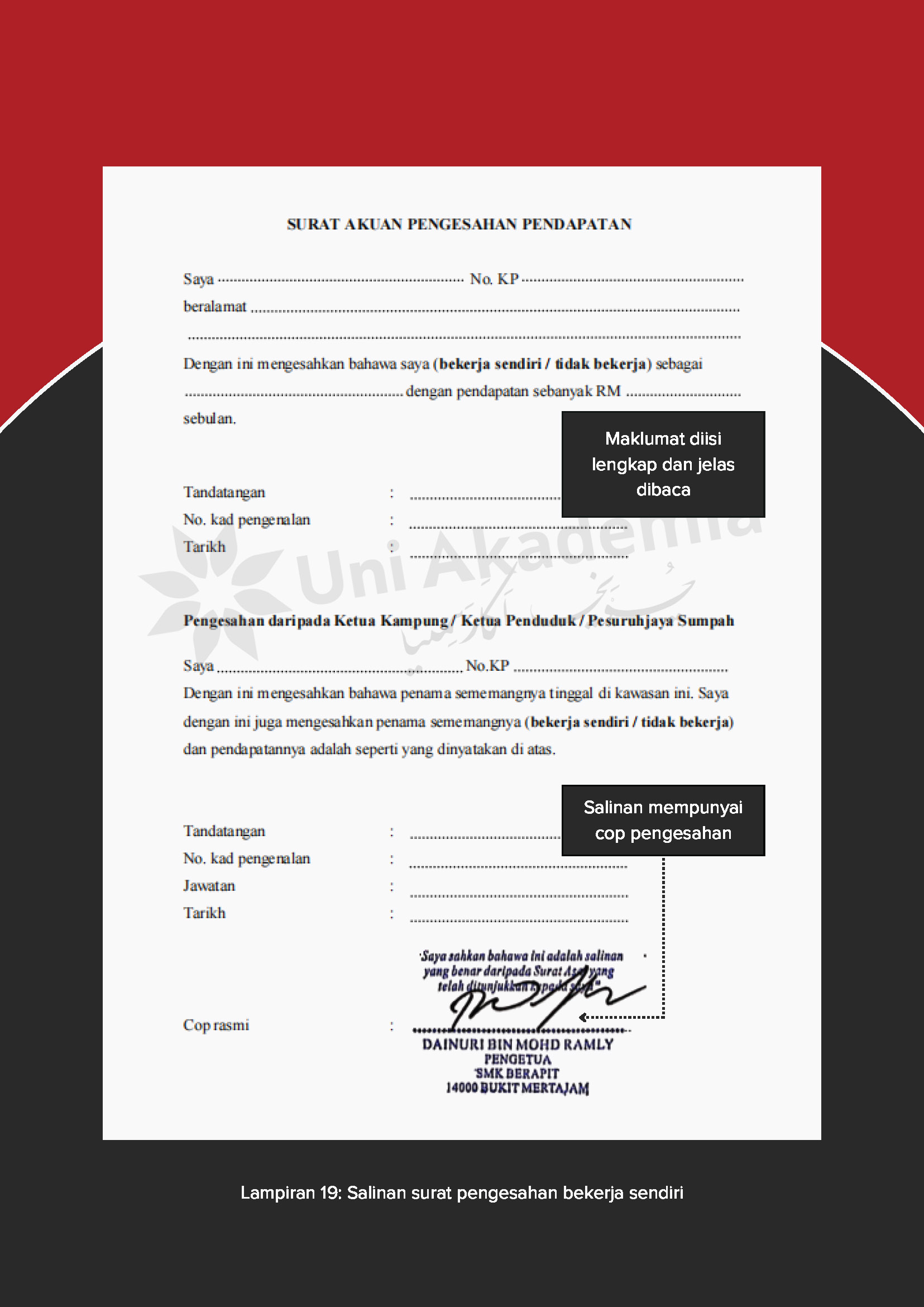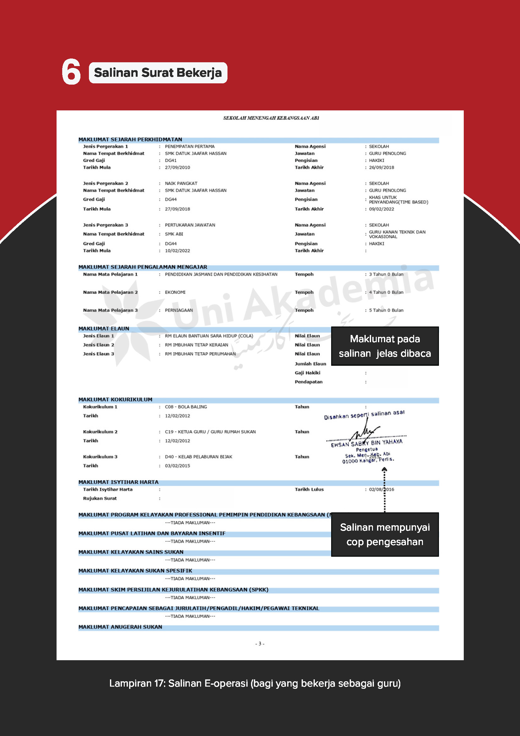 - Salinan E-Operasi (sekiranya bekerja sebagai guru) ATAU surat tawaran bekerja terkini (sekiranya bekerja) ATAU surat pengesahan bekerja (sekiranya bekerja sendiri)